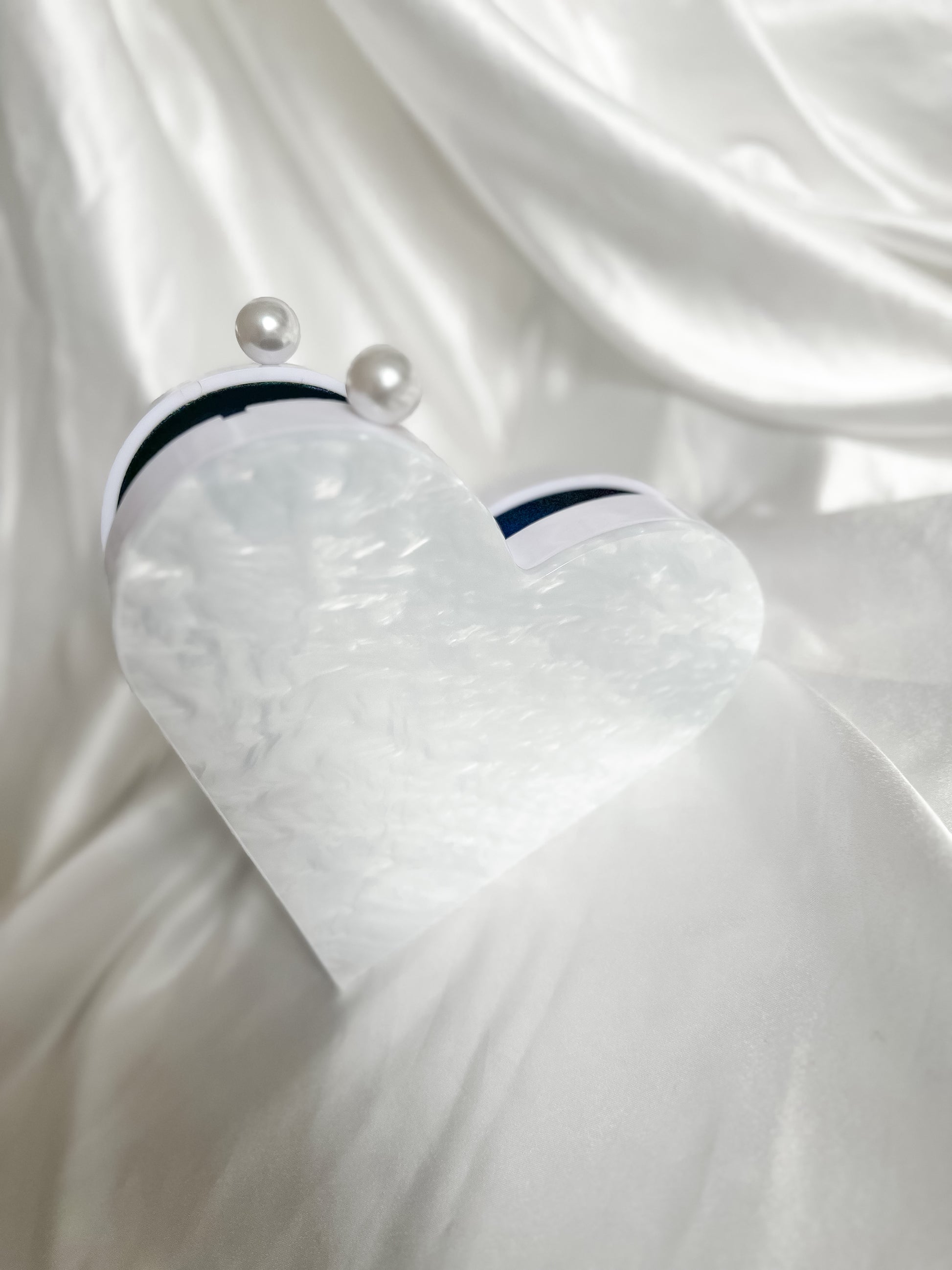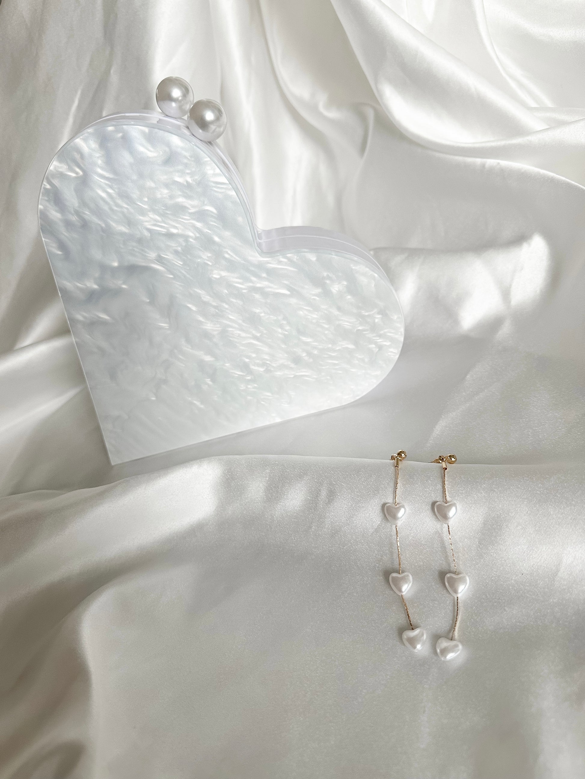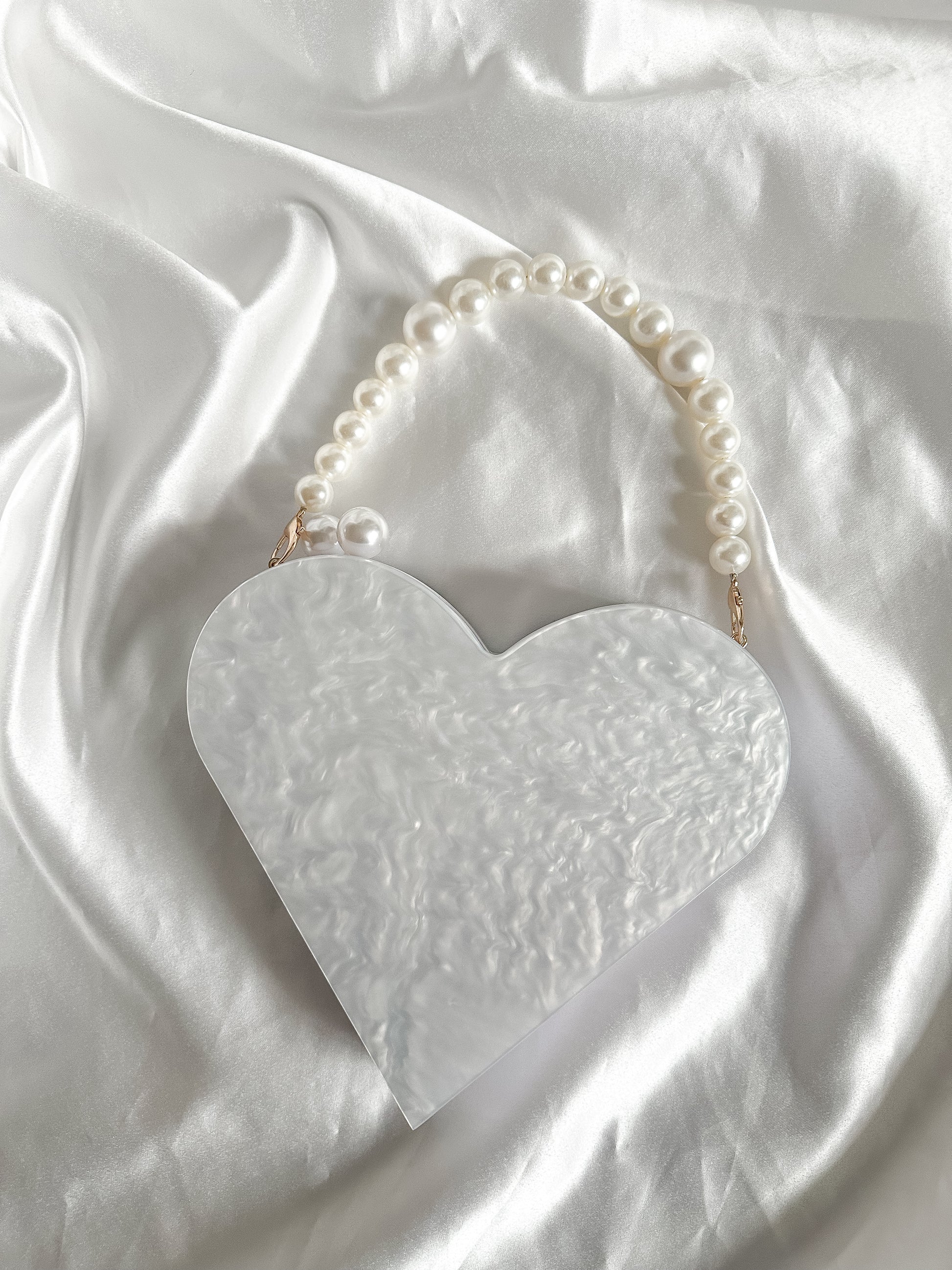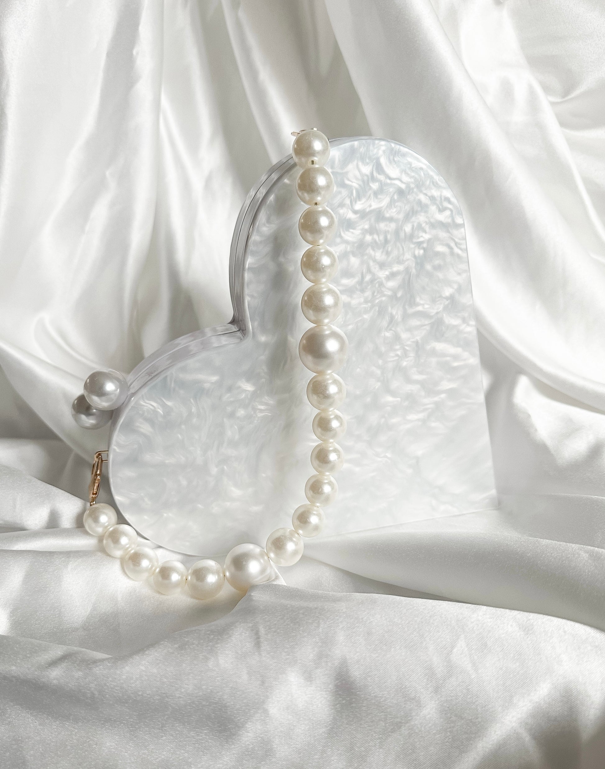 Meet D O V E our sweetheart shaped pearly clutch bag complete with a pearl strap - from hen to honeymoon, she’s the perfect addition to your bridal celebrations.