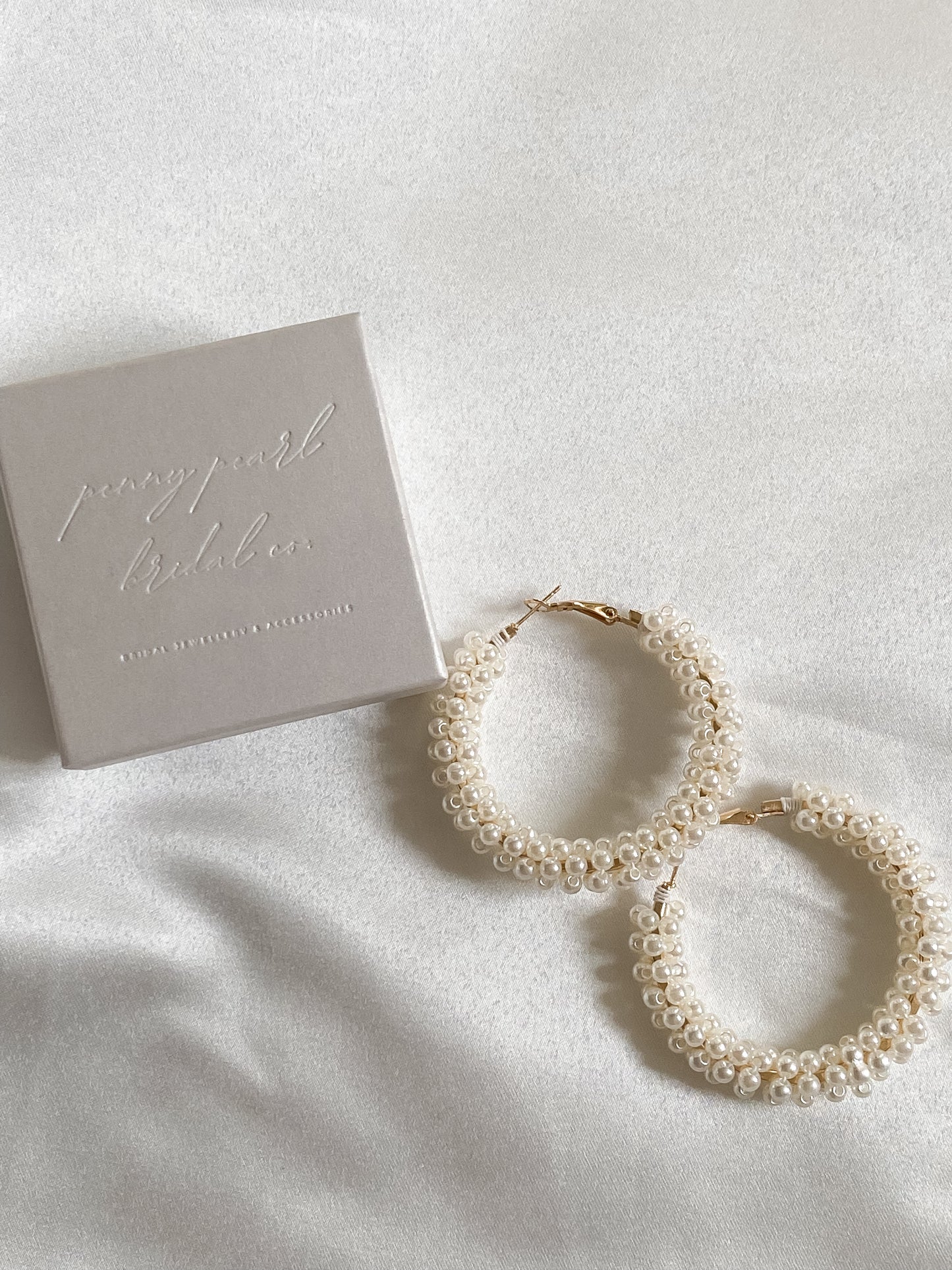 Make a statement with our H A L O hoops... gold halo hoop earrings wrapped beautifully in tiny ivory pearls.